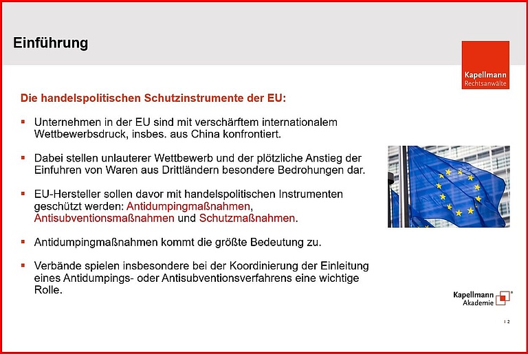 Deutsche und europäische Unternehmen stehen in einem zunehmend harten internationalen Wettbewerb. Nicht alle internationalen Handelspraktiken sind dabei fair und stehen in Übereinstimmung mit dem Welthandelsrecht der WTO. In solchen Situationen können europäische Unternehmen und ihre Verbände Handelsschutzinstrumente wie Antidumping- oder Antisubventionszölle bei der Europäischen Kommission beantragen.
